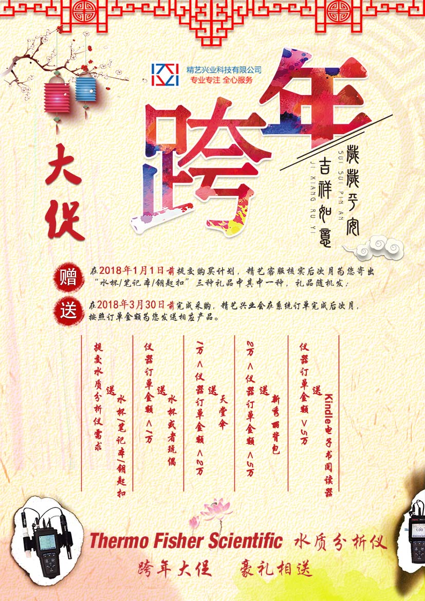 为了感谢广大用户对Thermo Fisher Scientific水质分析仪器产品的一贯支持与厚爱,即刻开启跨年大促销活动。从工厂到江河,从陆地到海洋,我们提供完整的水质分析解决方案。只要您有美国赛默飞世尔实验室水质分析仪器需求,即可获得精艺兴业送出的对应礼品。